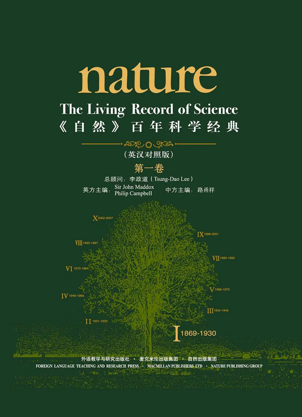 英汉双语对照版《〈自然〉百年科学经典》(Nature: the Living Record of Science)是由外语教学与研究出版社联合麦克米伦出版集团和自然出版集团共同策划编辑的科学主题丛书。丛书共十卷,收录并翻译了《自然》杂志自 1869 年创刊以来近 150 年间发表过的 840余篇经典文献,该丛书所选文章涵盖物理、化学、天文、地理和生物等基础学科及众多交叉学科。这是目前为止全国乃至全世界唯一的一套最大规模的《自然》杂志论文选集,堪称一部鲜活的近代科学史诗。